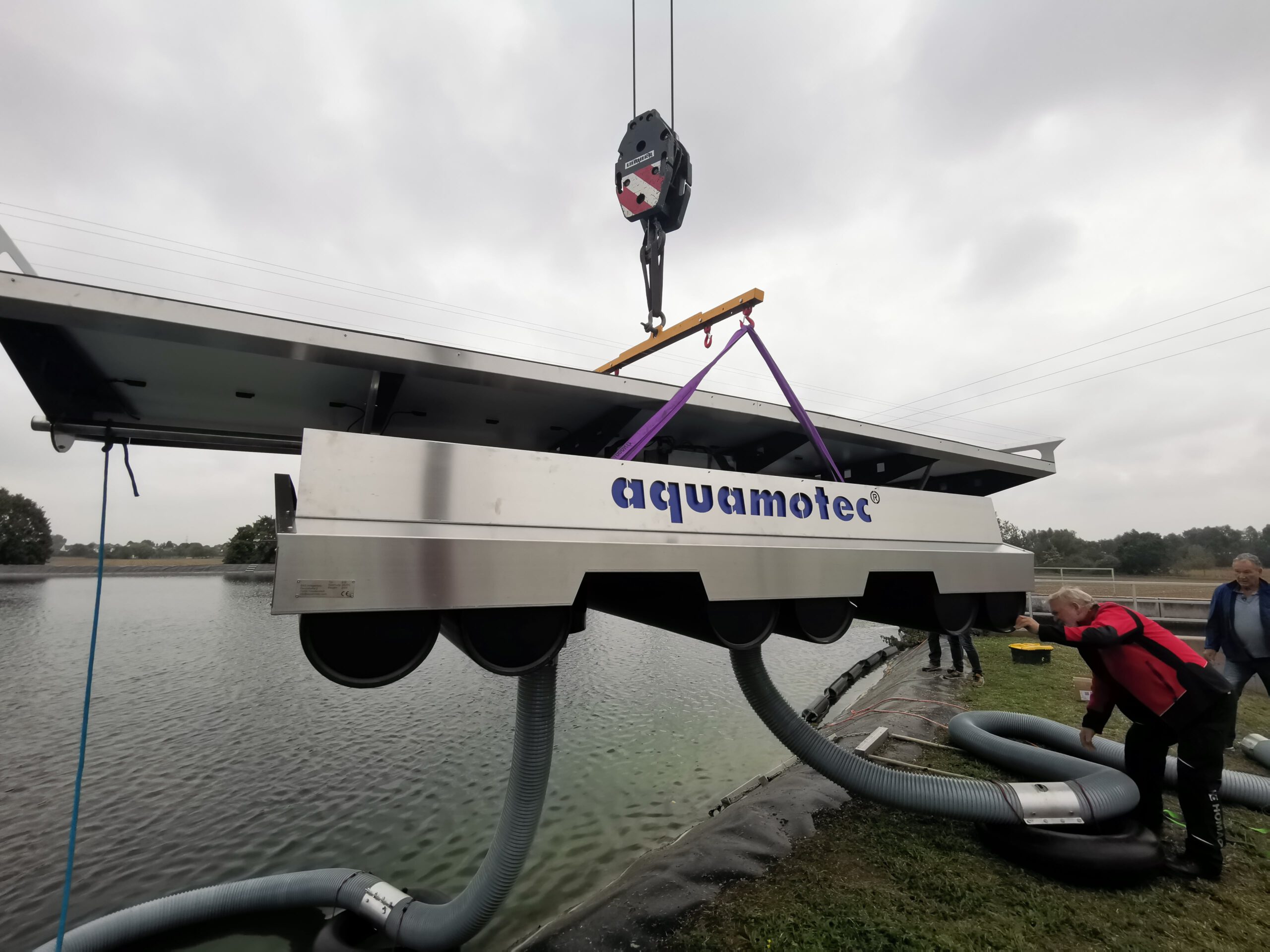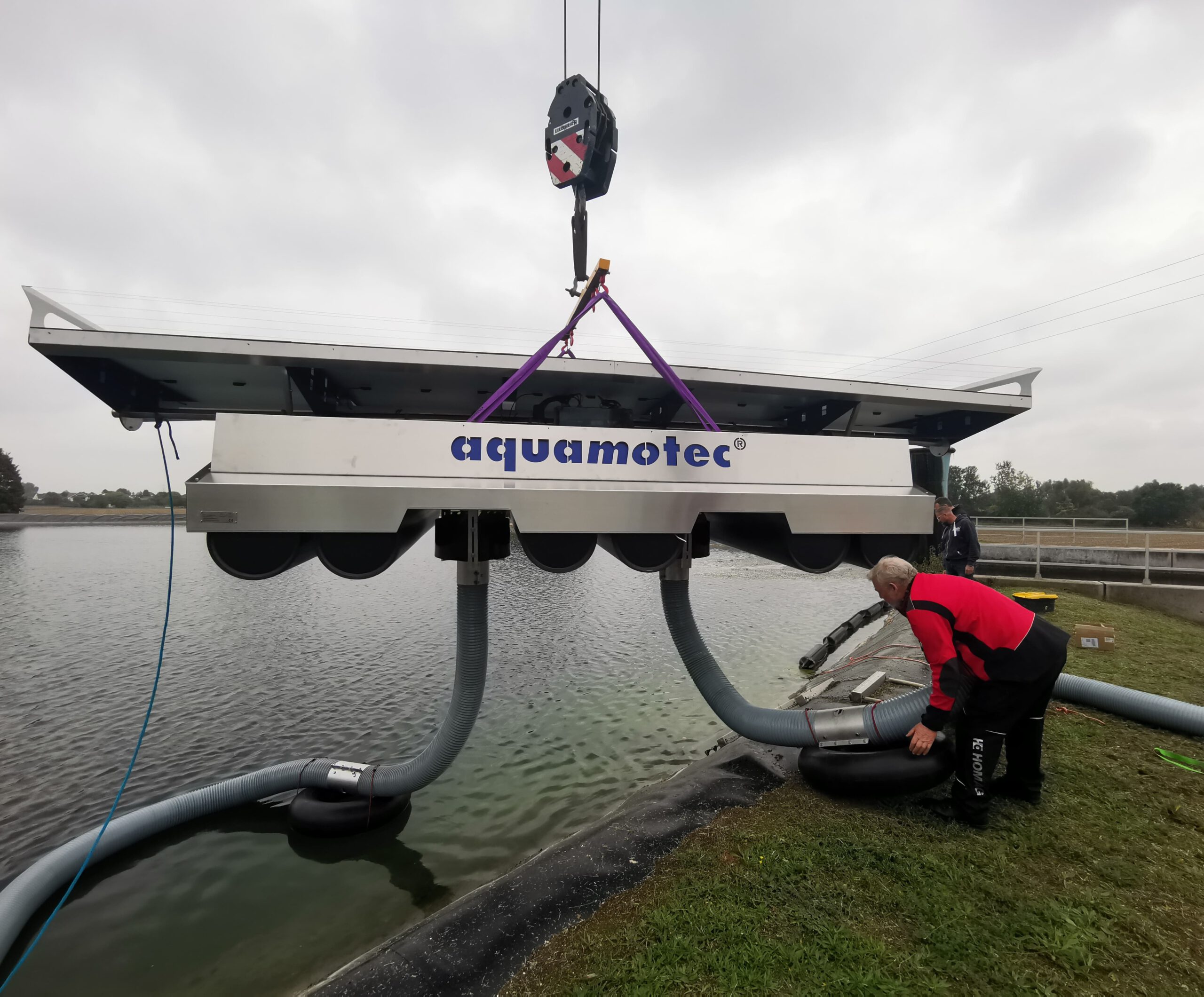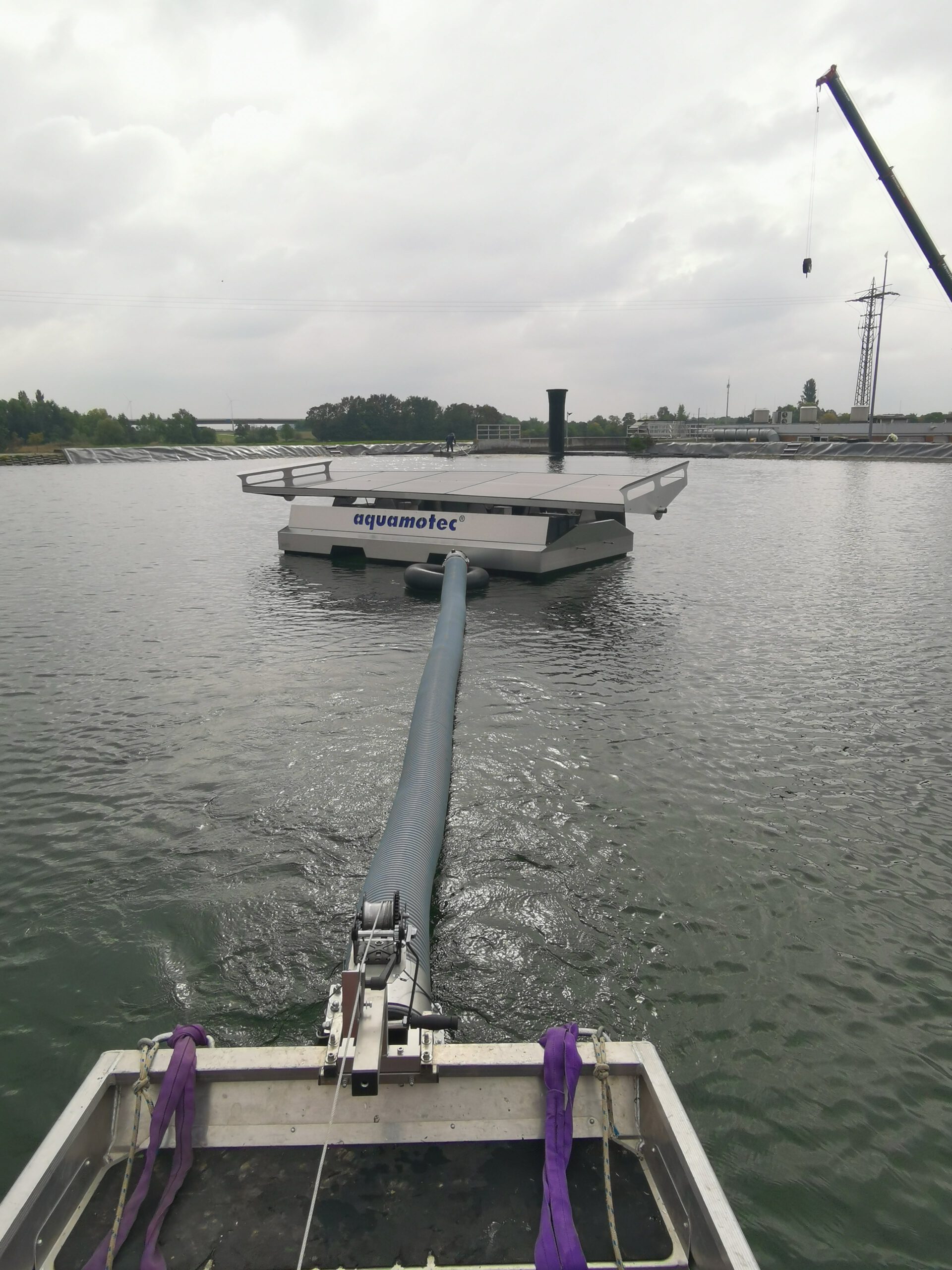 Eine besondere Herausforderung stellte die Folienauskleidung des Beckens dar, weshalb alle Unterwasserkomponenten wie Anker- und Entnahmemodule so konstruiert wurden, dass sie die Folie nicht beschädigten. Zu diesem Zweck wurden die Gewichte und Teile der Entnahmemodule in Gummi eingegossen und sanft mit einer Winde ins Wasser abgelassen. Dank sorgfältiger Vorbereitung und eines leistungsstarken bauseitigen Hebegeräts konnte die Anlage zudem über die Dammkrone gehoben werden.