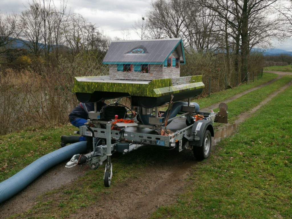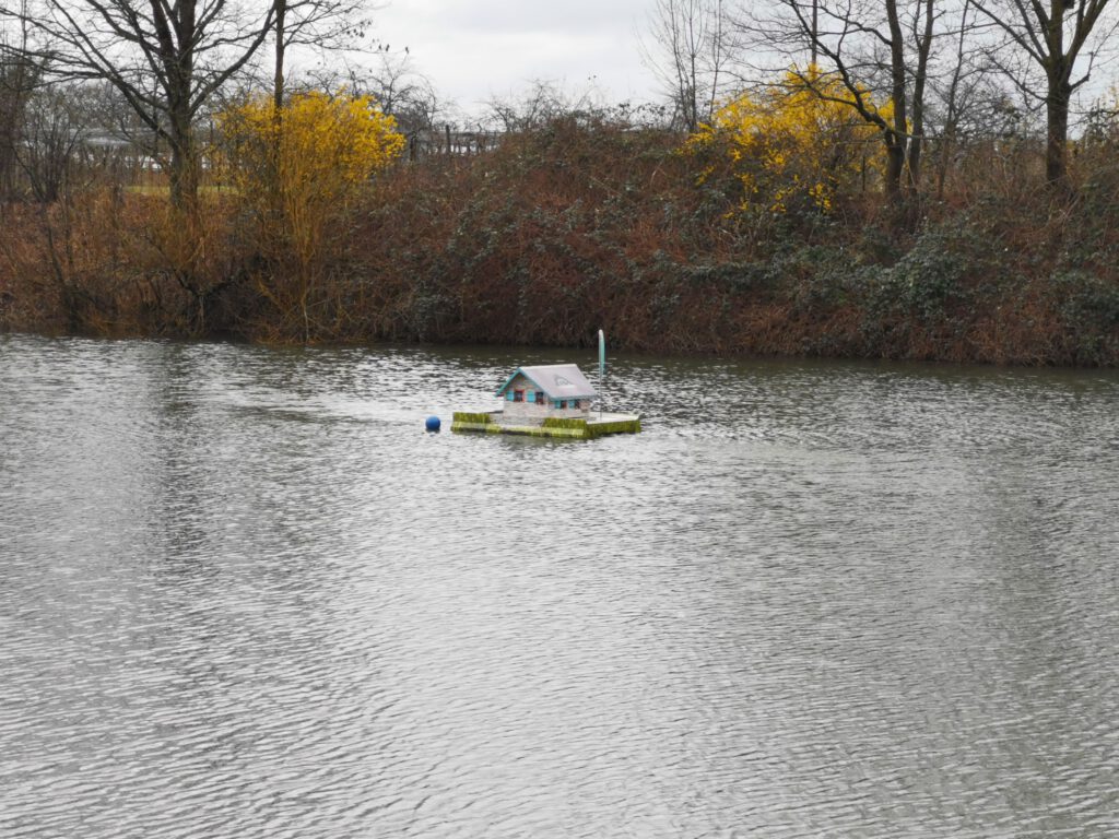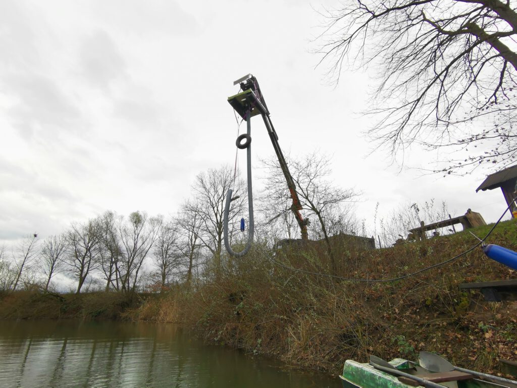 Auch dem Baggersee Erlach können wir ab sofort mit der Hilfe zur Selbsthilfe bei der natürlichen Regeneration helfen und haben gewässerökologisch günstig, gleich früh im Jahr eine Anlage vom Typ 2-SN eingebracht. Der See wurde vor über 10 Jahren bereitsl ausgebaggert. Durch einen nun stetig prognostizierten Schlammabbau soll eine solche Ausbaggerung in der Zukunft entfallen können. Eine Herausforderung beim Einbau war das steil abfallende Gelände zur Seefläche hinab. Dank eines gut organisierten großen Hebegeräts mit genügend Auslegerweite, konnte die Einbringung dann wieder gut und zügig, wie gewohnt umgesetzt werden. Wir danken dem Verein auch für die Bewirtung im Anschluss und wünschen für die kommende Saison einen guten und erfolgreichen Verlauf.